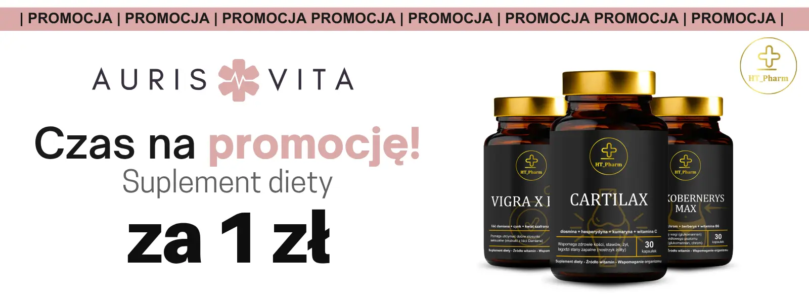 W ramach akcji „Suplement za 1 zł” każdy klient, który dokona zakupu dowolnego produktu marki Auris Vita (np. aparatu słuchowego lub akcesorium), może nabyć jedno opakowanie suplementu diety w promocyjnej cenie 1,00 zł brutto. Oferta obowiązuje w momencie zakupu – suplement należy dodać do paragonu lub faktury razem z produktem głównym.